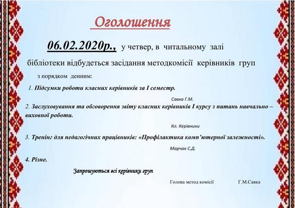 Оголошення! 5 Лютого, 20206 Лютого, 2020 Your Name 06.02.2020р. – засідання методкомісії керівників груп